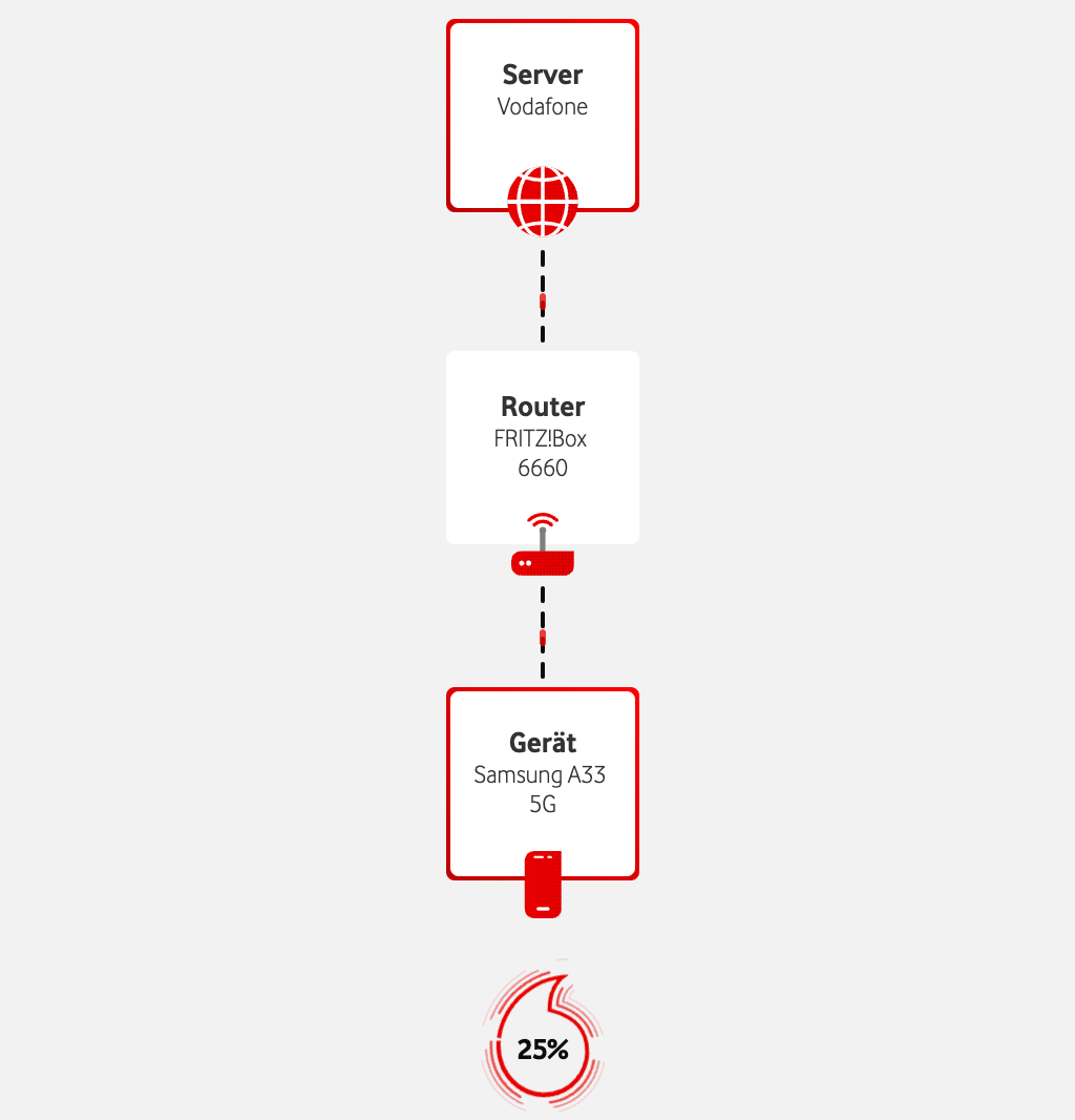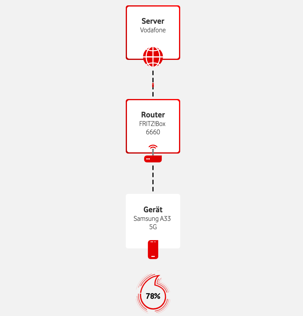 Das Messergebnis Deines Internet-Speedtests hängt von vielen Faktoren ab. Nicht alle stehen im direkten Zusammenhang mit Deiner Bandbreite. Das sind z.B. Deine Betriebssystem-Einstellungen, ein Anti-Virus Programm, Dein Browser und Deine LAN-Verbindung. Der Speedtest liefert Dir ungefähre Werte Deiner Bandbreite an Deinem Rechner. Die Bandbreite am Anschluss, also an Deinem Router, kann sehr davon abweichen. Für Vodafone-Kabelkund:innen haben wir daher eine zweite Messung entwickelt: Diese prüft unabhängig von Deinen Geräten die Strecke von unseren Servern bis zu Deinem Router.